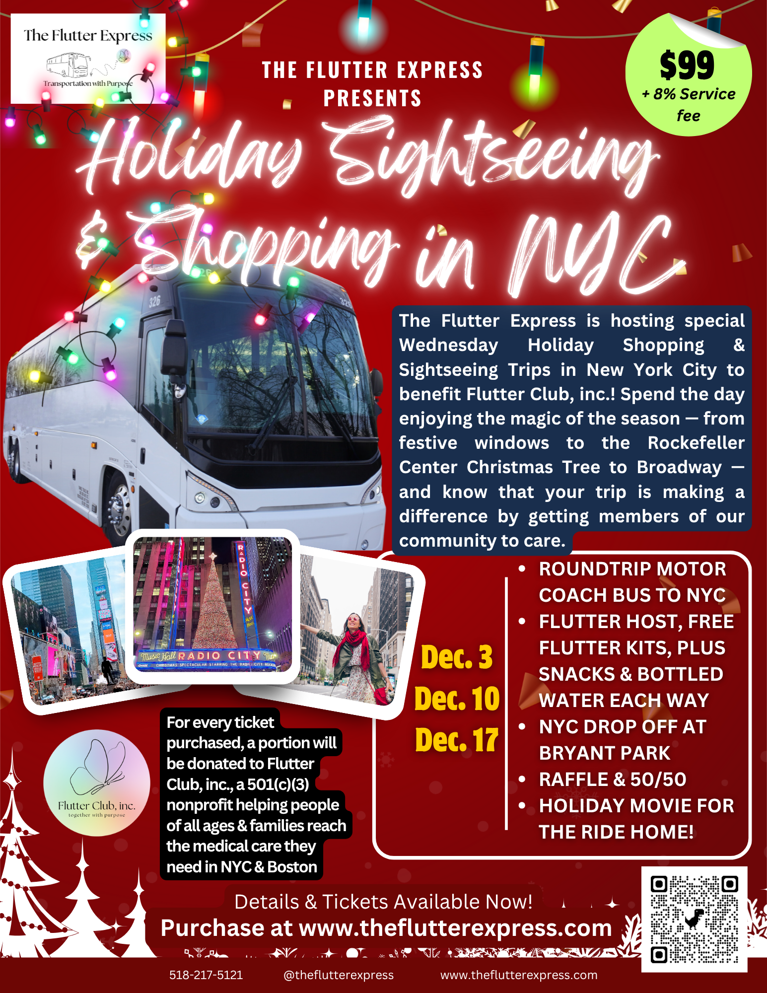 Join one of our fundraising trips OR host your own fundraising trip to NYC, Boston, or a destination within two hours of Albany, NY aboard The Flutter Express. We’d love to partner with you! Email us at together@flutterclub.com to start planning.